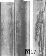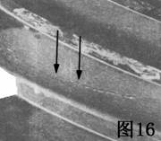 圖16滲碳層(硬化的表面)壓碎,表現(xiàn)在該錐形齒輪接觸表面上是縱長的裂紋.主要的裂紋從滲碳層心部結(jié)構(gòu)的深處開始,慢慢向表面延伸。