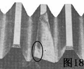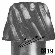 圖18是齒輪的典型疲勞缺陷,其特點(diǎn)是有光滑的地方.它是由重的載荷或震動載荷(不正確的換檔和操縱離合器)造成的。