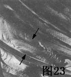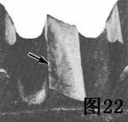 圖22是另一疲勞斷折的情況。箭頭指明裂紋在斷折處左邊緣開始,那里有一個(gè)小坑,靠近齒受壓側(cè)嚙合區(qū)的底部。緊靠裂源(箭頭指處)旁的地區(qū)受到充分的磨擦,說明裂紋起初發(fā)展緩慢。