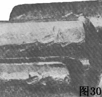 圖30所示為中等硬度齒輪由于碾壓和敲擊作用而造成的表面變形。這個(gè)齒輪很可能是受到超載荷,并且在有了初步的損傷之后長期使用,造成表面敲壞。