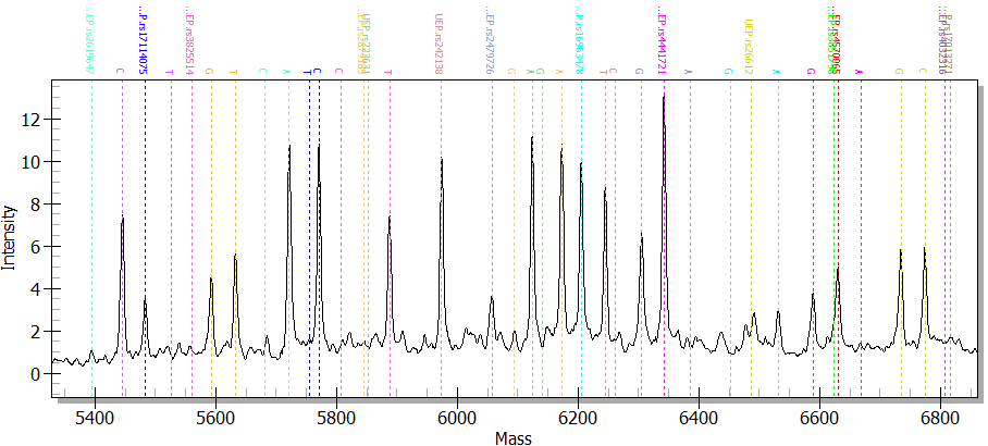 分型結(jié)果示例。以下是MassARRAYSNP基因分型飛行質(zhì)譜分析圖: