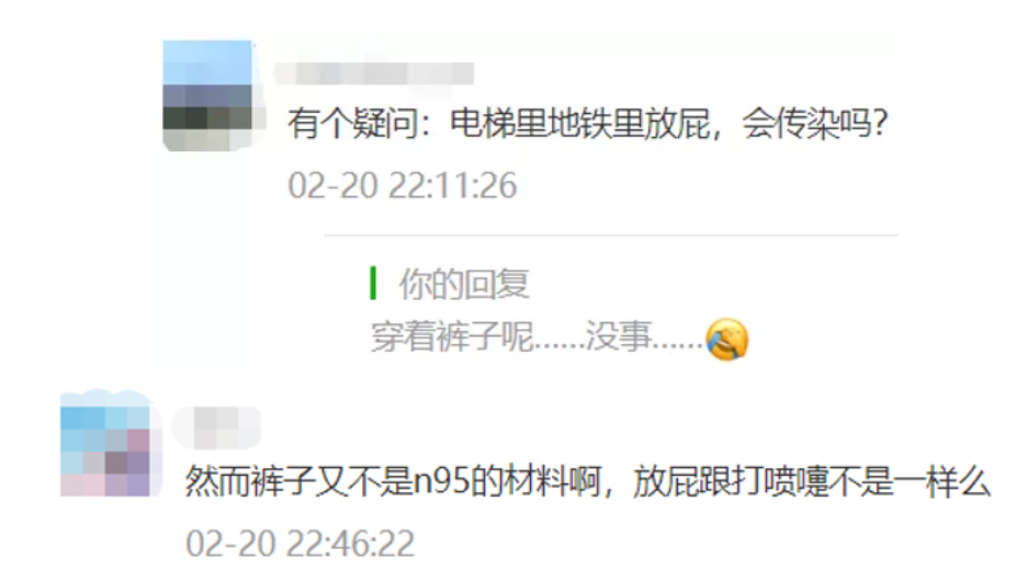 1. 正常穿著褲子的情況下,放屁是不會傳播新冠病毒的!通過放屁傳染新冠病毒需要滿足兩個基本條件: